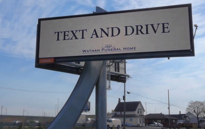 Η παρότρυνση είναι ξεκάθαρη. Η πινακίδα γράφει «Γράψτε μηνύματα ενώ οδηγείτε». Την υπογράφει το…