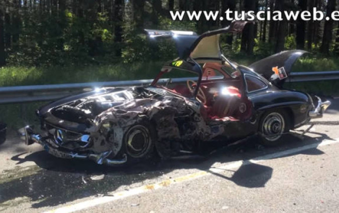 Ολική καταστροφή για μια 300SL Gullwin στον ιστορικό αγώνα Mille Miglia στην Ιταλία.Η Mercedes…