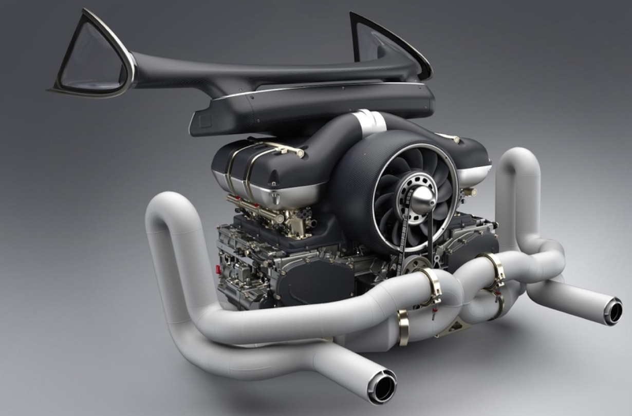 Το δημιούργημα των Singer, Williams και Mezger είναι ένας ατμοσφαιρικός, αερόψυκτος κινητήρας μπόξερ με χωρητικότητα 4,0 lt, τετραβάλβιδες κεφαλές, τέσσερις εκκεντροφόρους και διπλά μπεκ σε κάθε κύλινδρο. Η εισαγωγή είναι τύπου ram-air και καταλήγει σε ένα ανθρακονημάτινο φιλτροκούτι, ειδικά σχεδιασμένο έτσι ώστε να ευνοεί τη ροπή στις μεσαίες στροφές. Παρόλα αυτά, το μοτέρ στροφάρει πάνω από τις 9.000 rpm και αποδίδει 500 PS. Πολλά τμήματα από τιτάνιο, μαγνήσιο και ανθρακονήματα κρατούν το βάρος του χαμηλά, ενώ η εξάτμιση είναι φτιαγμένη από inconel και τιτάνιο.