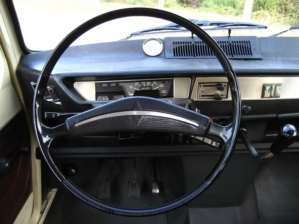 Στην καμπίνα, τα πλακάζ από ψεύτικο ξύλο και το τιμόνι με τον φουσκωμένο αφαλό συνδυάζονταν με ένα μονοκόμματο ταμπλό που έκρυβαν κάθε κομμάτι μετάλλου της καροσερί. Τα άνετα καθίσματα -ούτε λόγος εκείνη την εποχή για πλευρική στήριξη- με επένδυση απομίμηση δέρματος και με την αντίστοιχη γαρνιτούρα στις πόρτες, έδειχνε και ήταν σαφώς πιο ζεστό και άνετο, πιο χουχουλιάρικο από αυτό του 4L.