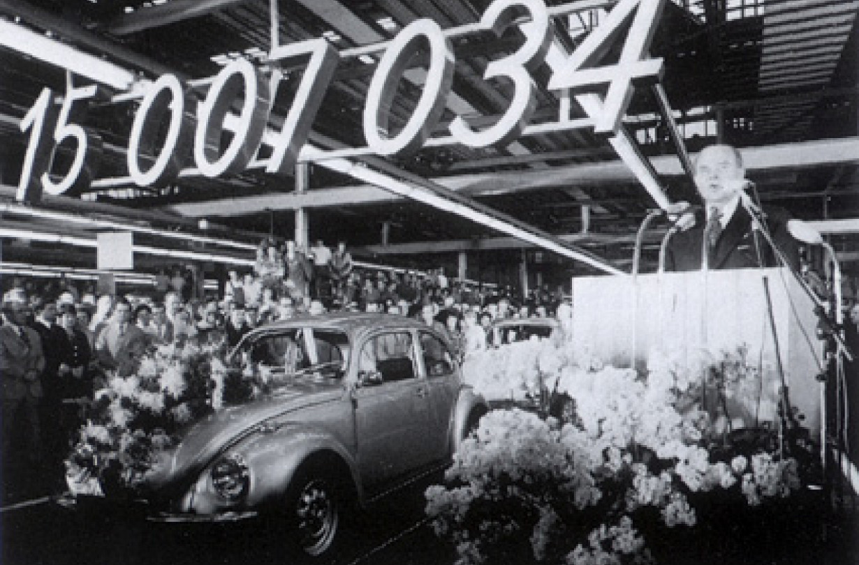 Ο 15.007.034ος Σκαραβαίος της Volkswagen άφησε πίσω του το εργοστάσιο της Volkswagen στο Wolfsburg της Γερμανίας, ξεπερνώντας το προηγούμενο ρεκόρ παραγωγής του Ford Model T, για να γίνει το πιο πολυάριθμο παραγόμενο αυτοκίνητο στην ιστορία.