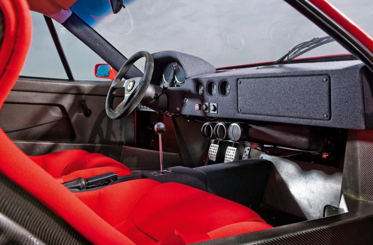 Όπως συμβαίνει με την εξωτερική εμφάνιση, εδώ μιλάμε για την πρώτη εντύπωση που παίρνει κανείς ανοίγοντας την πόρτα του αυτοκινήτου. Αυτό που αντικρίζεις μόλις ανοίξει την μικρή πόρτα μιας Ferrari F40 είναι το ιδανικό σκηνικό της… κόλασης. Προκαλεί φόβο, χωρίς αμφιβολία. Από την άλλη, δεν μπορούμε να σκεφτούμε κανένα άλλο αυτοκίνητο περισσότερο εστιασμένο στην οδήγηση. Αν δεν ξέρεις θα το πεις φτηνιάρικο και πρόχειρα φτιαγμένο. Σαν να βαρέθηκαν να το σχεδιάσουν, οπότε πέταξαν μερικούς διακόπτες όπως όπως. Οι πραγματικοί γνώστες όμως θα εκτιμήσουν λεπτομέρειες όπως το μαύρο ματ ύφασμα με το οποίο είναι ντυμένο το υποτυπώδες ταμπλό στο πάνω μέρος. Είναι για να εξουδετερώνει τις αντανακλάσεις.