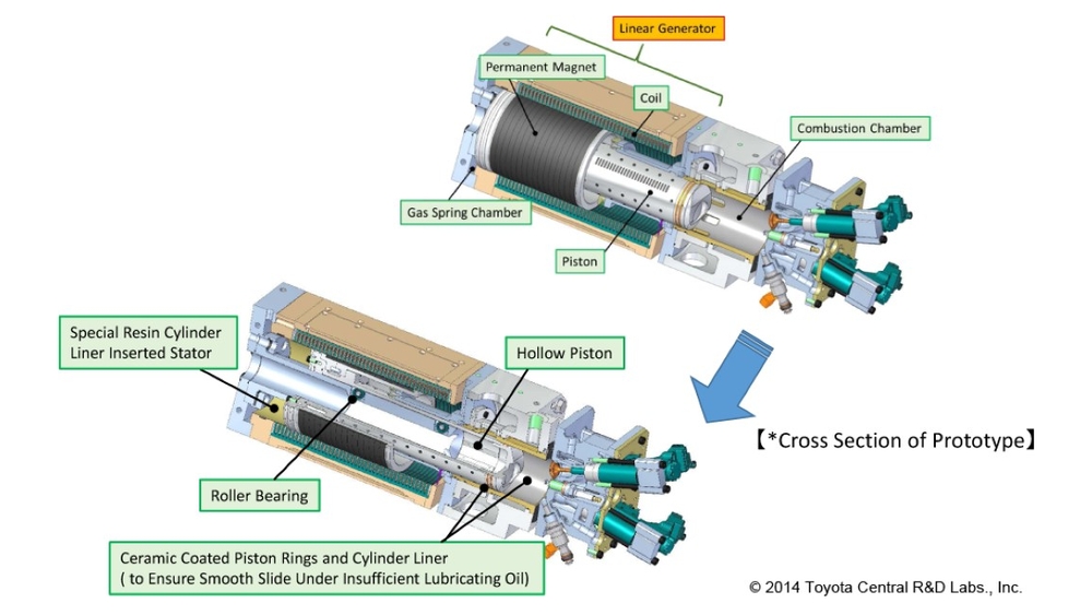 Κάπως έτσι πρέπει να σκέφτηκαν κάποιοι μηχανικοί της Toyota και βάλθηκαν να εξελίξουν ένα μονοκύλινδρο δίχρονο μοτέρ χωρίς στροφαλοφόρο άξονα. Το σύνολο πιστόνι-μπιέλα-στρόφαλος έχει αντικατασταθεί από ένα μεγάλο, μονοκόμματο έμβολο με διατομή σχήματος «W». Το κεντρικό, μακρύτερο τμήμα του φτάνει ως τον θάλαμο καύσης, όπου έχει τη μορφή ενός κανονικού πιστονιού. Ο κύλινδρος που αποτελεί τις πλευρές του «W» είναι ένας ισχυρός μαγνήτης, που όπως κινείται μέσα στο πηνίο που τον περικλείει παράγει ρεύμα. Η επιστροφή του εμβόλου από το ΚΝΣ στο ΑΝΣ γίνεται χάρη στο αέριο υπό πίεση που υπάρχει στην κάτω πλευρά του W.