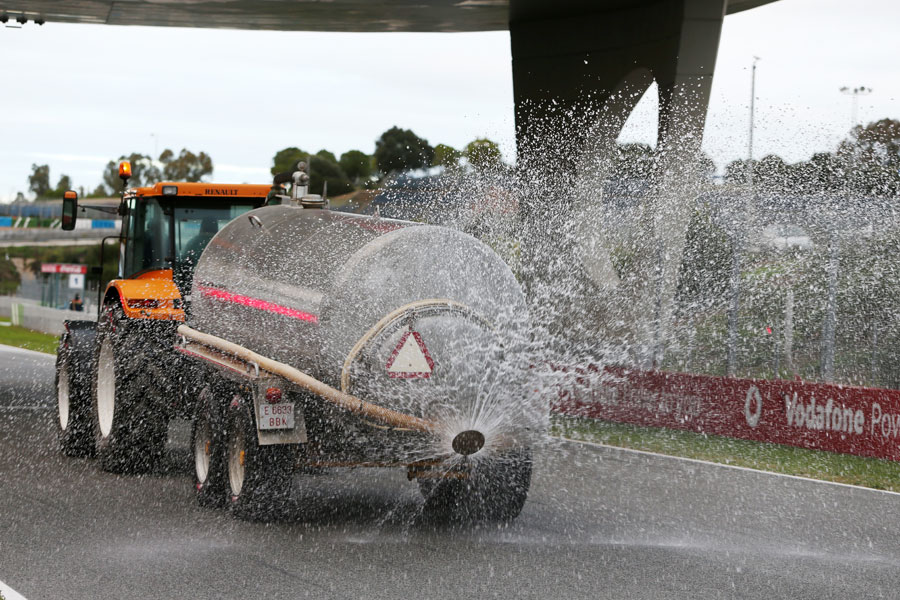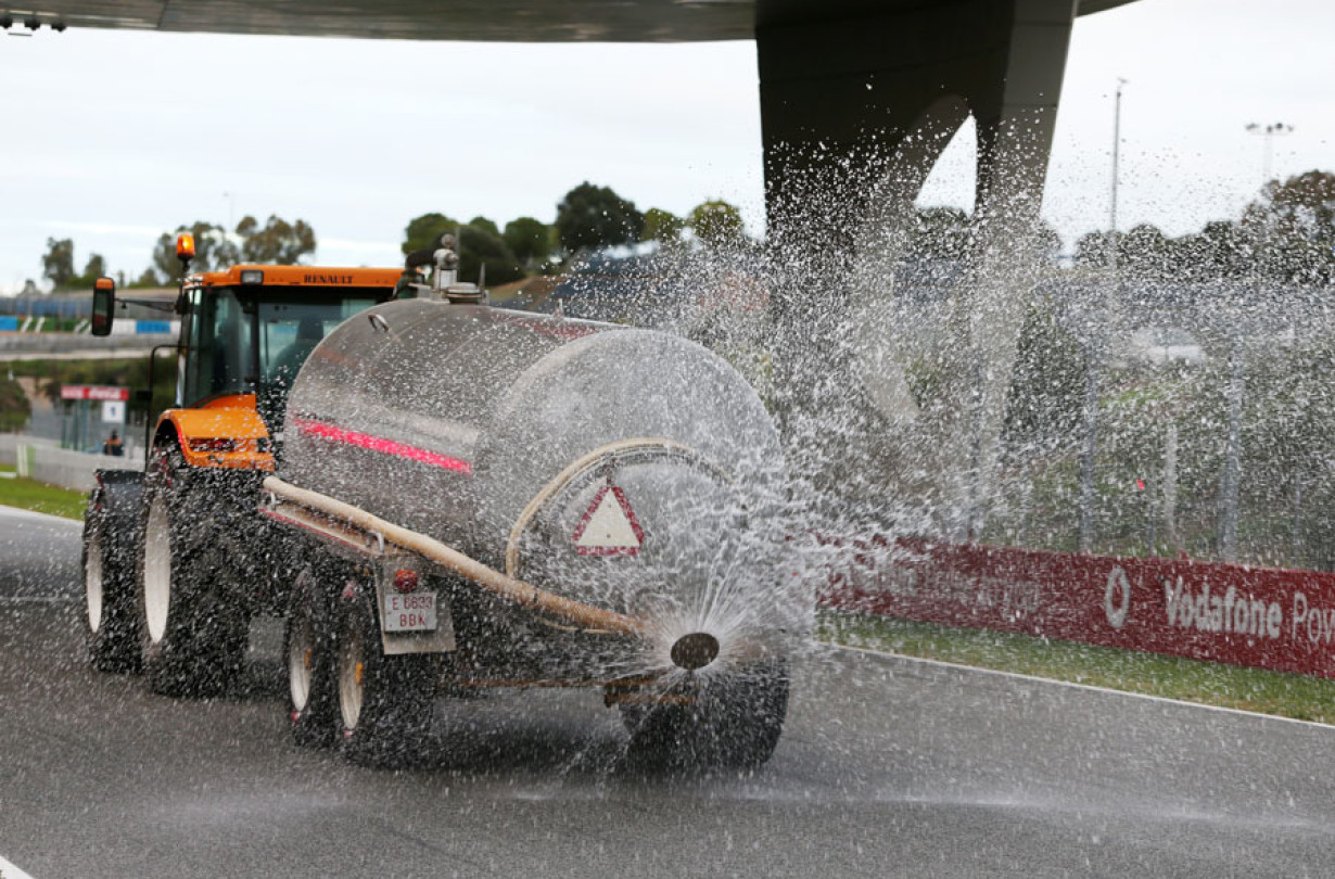 Μάλιστα, και επειδή η βραδυνή βροχή που έπεσε στη Jerez δεν ήταν αρκετή για να δημιουργήσει τις ιδανικές συνθήκες, το ειδικό όχημα της πίστας βγήκε και άρχισε να καταβρέχει το οδόστρωμα.