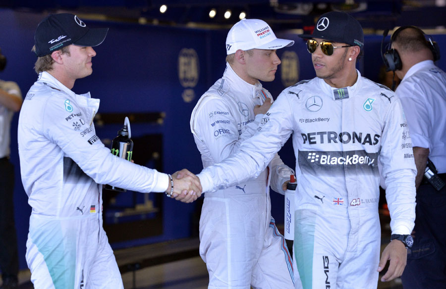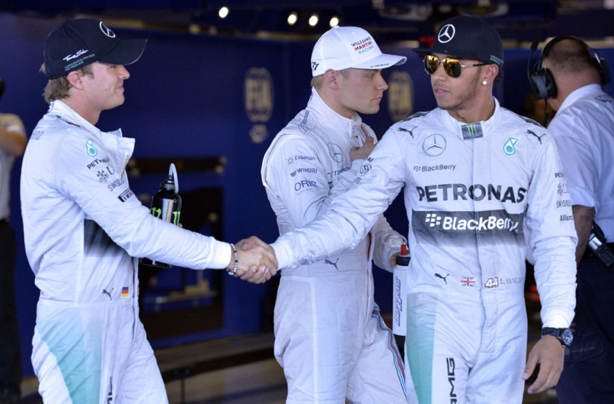 Στη δεύτερη θέση ο ομόσταυλός του Nico Rosberg που προσπάθησε αλλά δεν μπόρεσε να απειλήσει τον Βρετανό σε αντίθεση με τον τρίτο Valtteri Bottas, ο οποίος φάνηκε ότι με τη Williams θα μπορούσε να μπει σφήνα ανάμεσα στις δύο Mercedes αν δεν έκανε ένα λαθάκι στον τελευταίο γύρο του Q3. Μάλιστα οι χρόνοι του Φινλανδού φλερτάριζαν ακόμη και με την πρώτη θέση, σε αντίθεση με τον ομόσταυλό του Felipe Massa που δεν μπόρεσε να προκριθεί στο Q2 λόγω προβλήματος στην πίεση των καυσίμων.