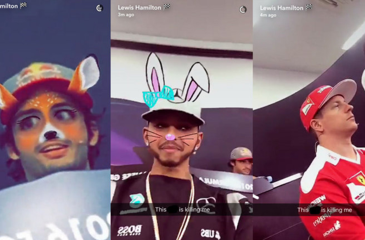 Ο λόγος; Κάποια γεγονότα που συνέβησαν την Πέμπτη, στην διάρκεια της καθιερωμένης συνέντευξης Τύπου με την οποία ανοίγει το αγωνιστικό τριήμερο. Ο Hamilton, την ώρα της συνέντευξης Τύπου έβγαζε φωτογραφίες τις οποίες πόσταρε εκείνη την στιγμή στον λογαριασμό του στο Snapchat. Όπως βλέπετε και στην φωτογραφία πιο πάνω, στο ένα στιγμιότυπο είναι ο ίδιος ο Hamilton με αυτιά και μύτη λαγού και ένα καρότο στο στόμα. Την εικόνα συνοδεύει η ατάκα «Αυτή η μ@λ@κι@ με σκοτώνει…». Στην άλλη εικόνα είναι ο Carlos Sainz Jr. με αυτιά και μύτη αλεπούς. Όταν ρωτήθηκε επί τόπου για το τι κάνει, ο Hamilton απάντησε «είναι κάτι δικό μου, αστείο…».