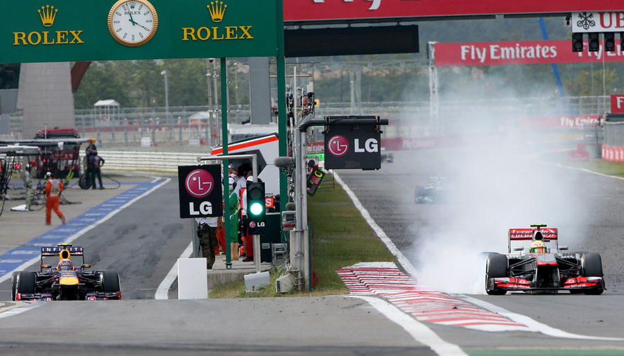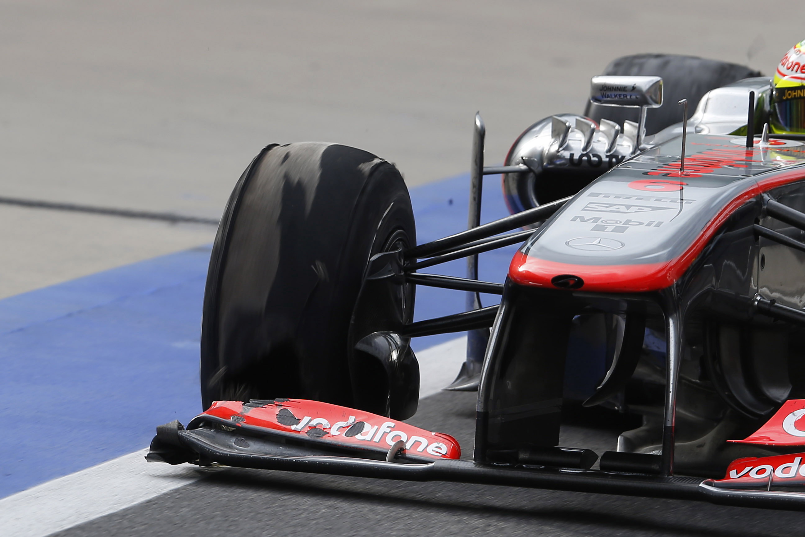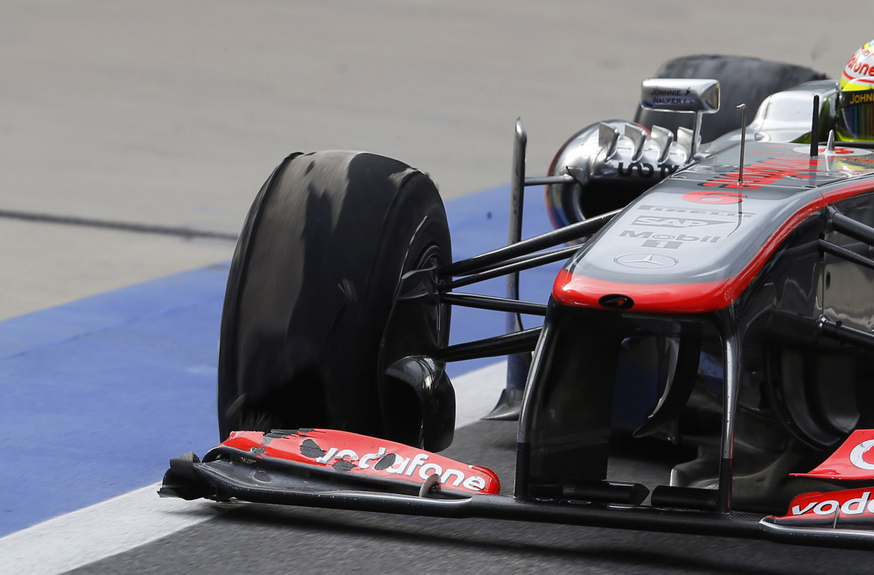 Στον αγώνα της Κορέας είναι αλήθεια ότι το εμπρός δεξί ελαστικό δεχόταν τη μεγαλύτερη καταπόνηση από όλα, λόγω της φοράς της πίστας και της ιδιαιτερότητας των στροφών. Ετσι, μετά από ένα δυνατό φρενάρισμα λίγο πριν την έξοδο των πιτ, το δεξί εμπρός ελαστικό του Perez κατέρρευσε με αποτέλεσμα να ξεκολλήσει όλο το πέλμα του, να σπάσει την αεροτομή και να γεμίσει η πίστα τόσο από κομμάτι ανθρακονήματος όσο και από κομμάτια ελαστικού.