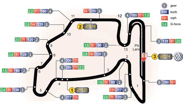 Έτσι απαιτείται σετάρισμα υψηλής αεροδυναμικής πίεσης καθώς τα μονοθέσια επιταχύνουν με τέρμα γκάζι μόνο για 10 δεύτερα περίπου σε κάθε γύρο της πίστας των 4.381 χλμ, ενώ στον περυσινό αγώνα αποδείχθηκε πως η τακτική των δύο πιτ στοπ ήταν η ενδεδειγμένη.