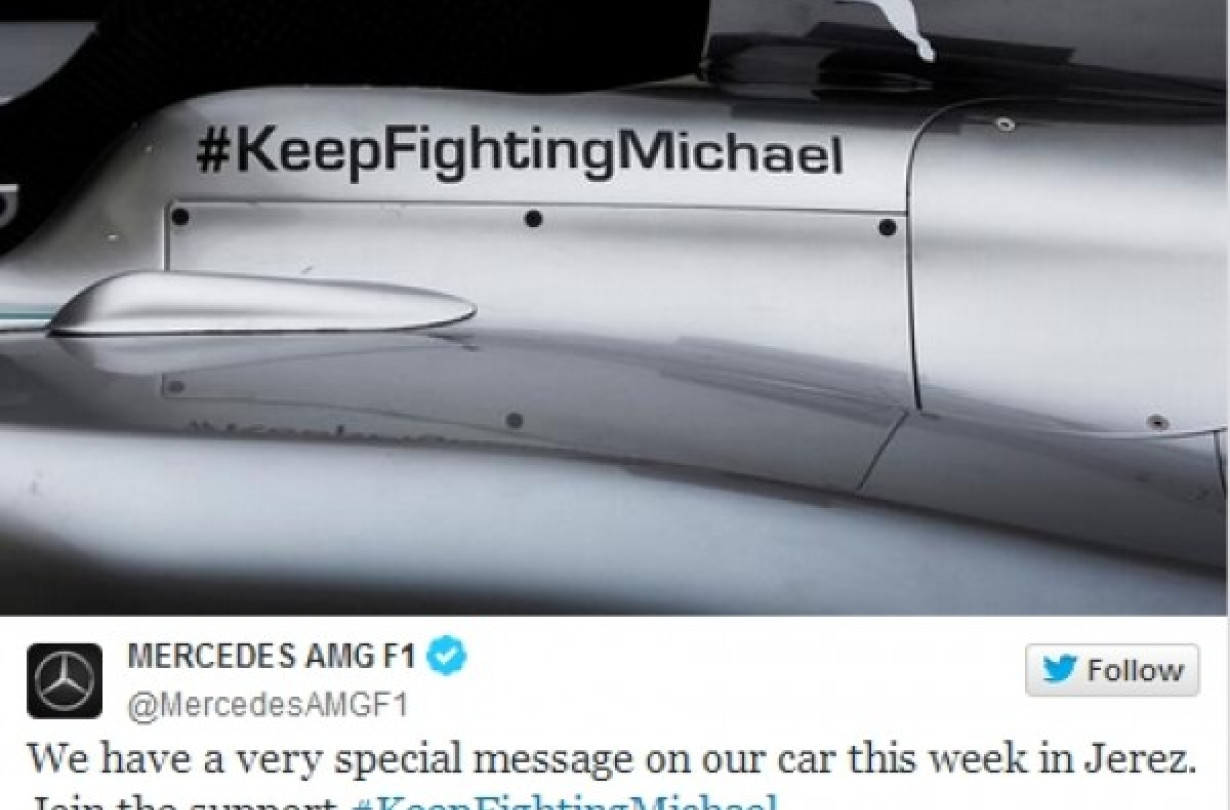 Υπενθυμίζουμε ότι η Mercedes ήταν η τελευταία ομάδα με την οποία μετείχε στην Formula 1 ο Γερμανός οδηγός. Θέλοντας να δείξουν ότι η σκέψη τους είναι στον Schumacher, οι ιθύνοντες της ομάδας αποφάσισαν τα μονοθέσια της ομάδας που θα συμμετέχουν στις αυριανές δοκιμές στην πίστα της Χερέθ να φέρουν το μήνυμα "Συνέχισε να πολεμάς Michael ".