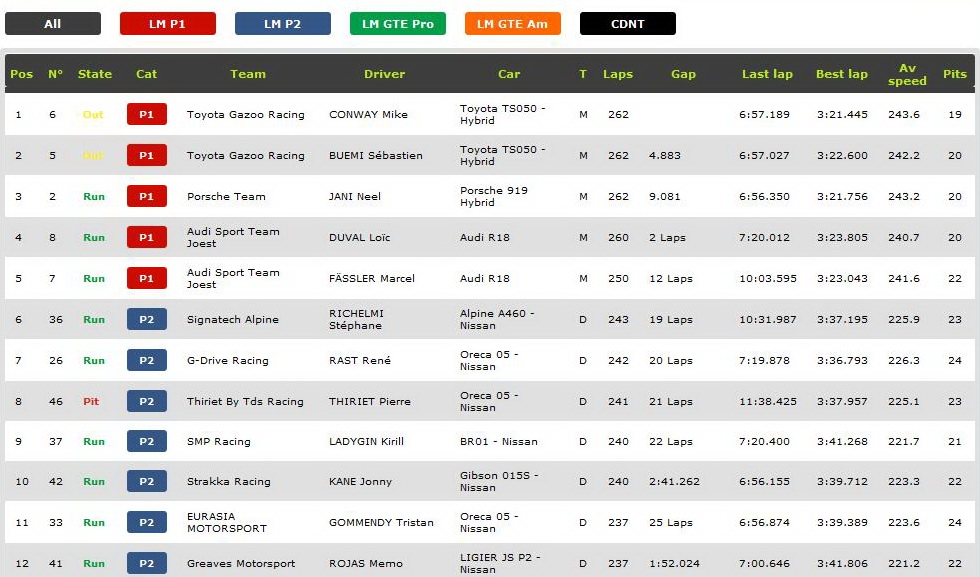 H πρώτη Toyota έχει κάνει 18 ανεφοδιασμούς, η δεύτερη 19, έναντι των 20 της Porsche. Και αυτός ο συνδυασμός ταχύτητας και οικονομίας είναι που της δίνει αυτή την στιγμή το πλεονέκτημα. Στο πρώτο μισό του αγώνα ο Kobayashi με Toyota είχε κάνει τον ταχύτερο γύρο, αλλά τη νύχτα η Porsche επιβεβαίωσε το πλεονέκτημά της σε απόλυτη ταχύτητα με τον Neel Jani να κάνει τον ταχύτερο πέρασμα στον αγώνα. Αυτή την στιγμή ωστόσο, με την θερμοκρασία αρκετά χαμηλά, οι Toyota φαίνεται να δουλεύουν καλύτερα τα λάστιχά τους. Στην Porsche ελπίζουν ότι όταν ο ήλιος ανέβει ψηλά και ζεσταθεί η άσφαλτος, θα βρουν και πάλι ταχύτερο ρυθμό ώστε αντισταθμίζοντας με ταχύτητα το πλεονέκτημα της Toyota σε οικονομία καυσίμου να πιέσουν για τη νίκη.