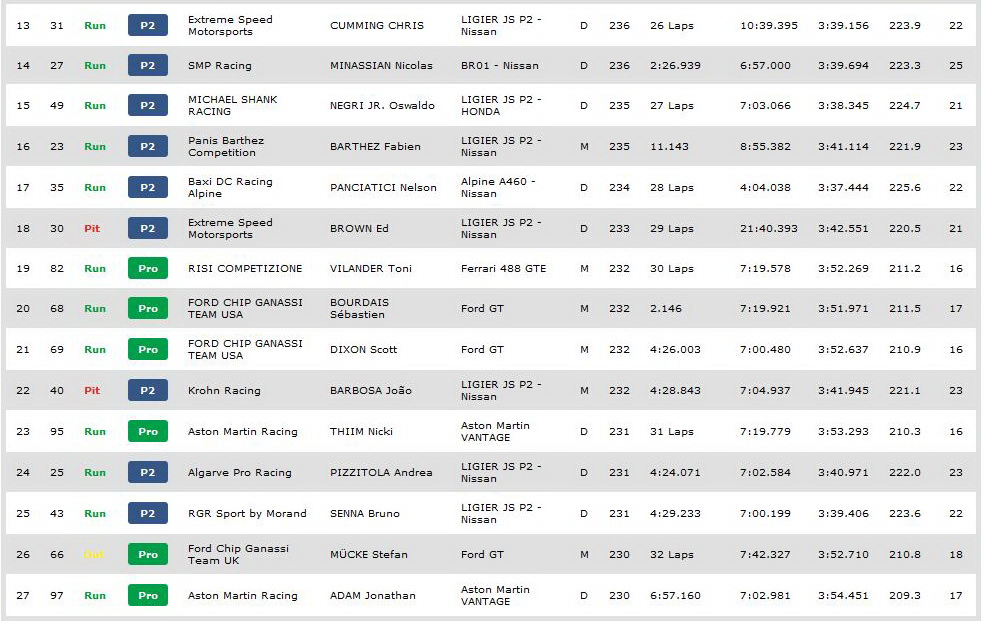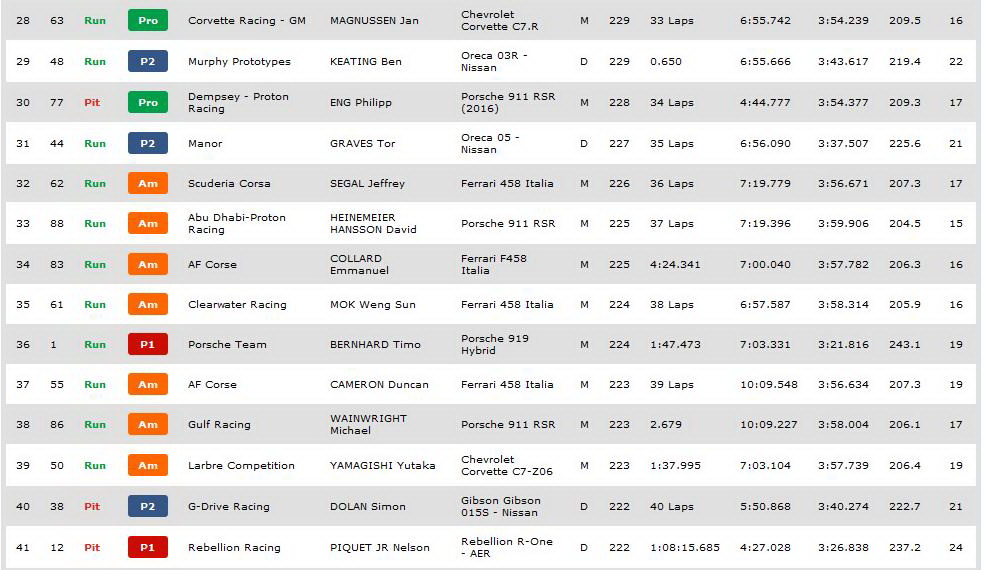 Στην 4η και 5η θέση συνεχίζουν τα δύο Audi που αντιμετώπισαν σοβαρά προβλήματα με τα τούρμπο και έχασαν πολύ χρόνο. Η #1 Porsche που οδηγούσε τον αγώνα τις πρώτες ώρες και στη συνέχεια ακολουθούσε από την δεύτερη θέση και διεκδικούσε τη νίκη αντιμετώπισε σοβαρά προβλήματα γύρω στα μεσάνυχτα, στην αρχή με υπερθέρμανση κινητήρα και στη συνέχεια με την μετάδοση. Έμεινε πολλούς γύρους στα pits και αυτή τη στιγμή είναι στην36η θέση.