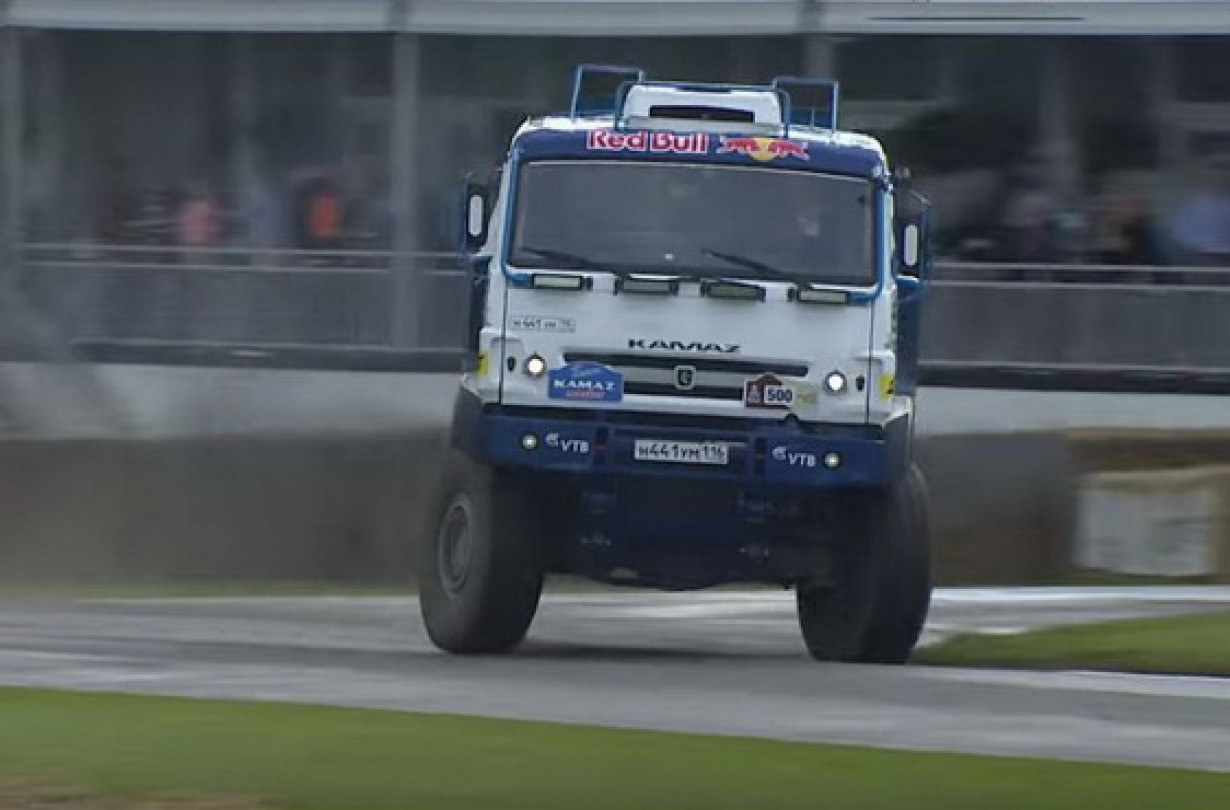 Ανάμεσα στα αγωνιστικά κάθε κατηγορίας, από μονοθέσια Formula 1, θρυλικά αυτοκίνητα ράλι και τουρισμού και ένα στόλο από σούπερκαρ που ήρθαν να σπάσουν το ρεκόρ των αυτοκινήτων παραγωγής στην διάσημη ανάβαση, ξεχώρισε αυτό το Red Bull Kamaz 4326. Ένα αγωνιστικό φορτηγό του Ράλι Ντακάρ. Ζυγίζει 10 τόνους και είναι με διαφορά το ψηλότερο όχημα που έχει ανηφορίσει τον λόφο του Goodwood. Κινείται από έναν V8 τούρμπο ντίζελ, σε συνδυασμό με ένα 16τάχυτο κιβώτιο της ZF. Η ροπή φτάνει τα... 276 kgm!!! Και κατανέμεται σε όλους τους τροχούς. Η τελική του φτάνει τα 162 km/h.