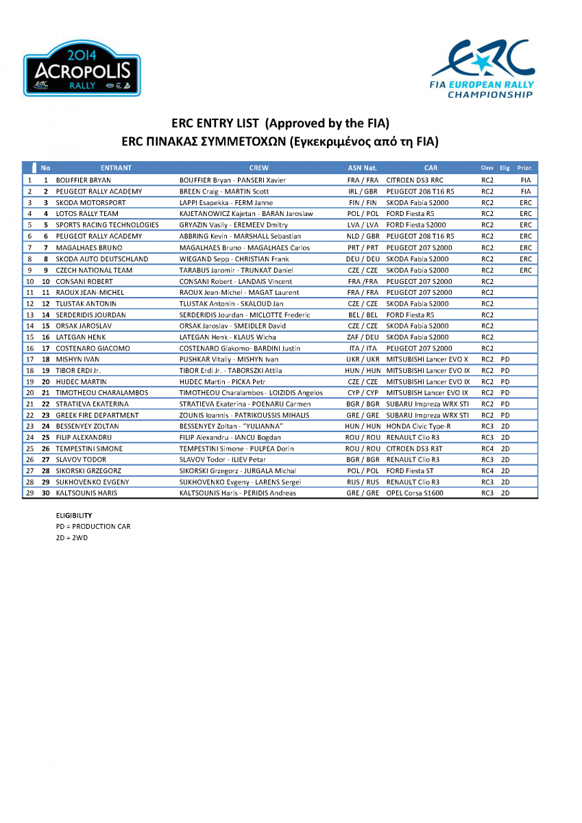 Ανάμεσα στους 29 συμμετέχοντες που θα αγωνιστούν στο Ράλι Ακρόπολις στο πλαίσιο του 3ου γύρου του Ευρωπαϊκού Πρωταθλήματος Ράλι, αναμενόμενα, βρίσκεται η εργοστασιακή ομάδα της Skoda, αλλά και η αντίστοιχης δυναμικής Skoda Γερμανίας με τους Esapekka Lappi και Sepp Wiegand, αντίστοιχα, ωστόσο τις εντυπώσεις αναμένεται να κερδίσει η εργοστασιακή ομάδα της Peugeot, που επέλεξε την Ελλάδα για την παγκόσμια πρώτη του ολοκαίνουργιου 208 Τ16 R5 στο ERC, με τους ταλαντούχους Craig Breen και Kevin Abbring στα πηδάλιά του. Το «παρών» επίσης στην Ελλάδα επέλεξε να δώσει και ο Γάλλος Bryan Bouffier με το Citroen DS3 RRC, ο οποίος πριν από μερικούς μήνες τερμάτισε 2ος στο Ράλλυ Μόντε Κάρλο και, παράλληλα με τη συμμετοχή του στο WRC, ακολουθεί επιλεκτικά ορισμένους αγώνες του ERC.