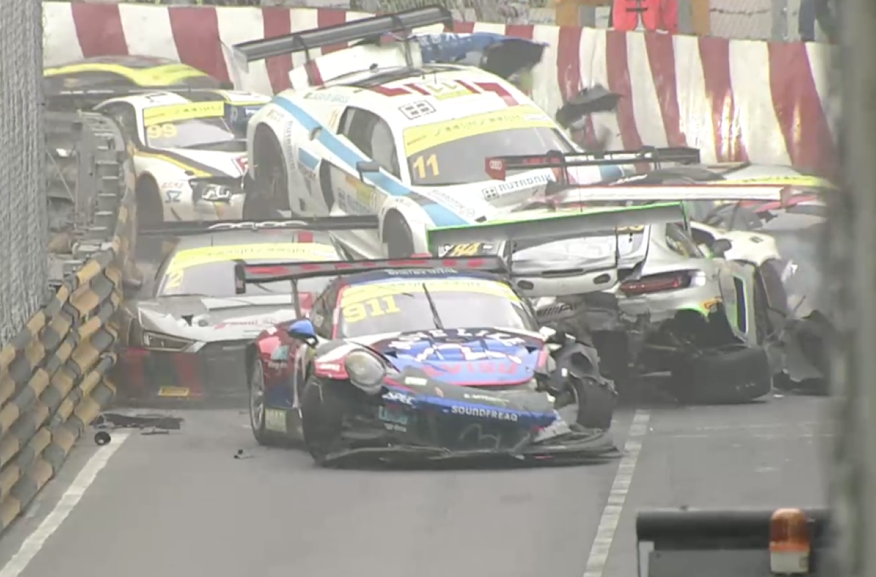 Συνολικά 16 αυτοκίνητα συγκρούστηκαν στη καμπή Police, μία από τις πιο στενές σε πλάτος στο μήκους 6,1 χιλιομέτρων σιρκουί πόλης του Macau. Όλα έγιναν όταν ο 4ος εκείνη την ώρα Daniel Juncadella τράκαρε στις μπαριέρες στην έξοδο της στροφής και η Mercedes του έκλεινε το δρόμο. Ο Raffaele Marciello που ερχόταν από πίσω ήταν ο μόνος που διασώθηκε, αφού κατάφερε να περάσει το αυτοκίνητό του από μια χαραμάδα. Αλλά ο Laurens Vanthoor δεν μπόρεσε να αποφύγει την τρακαρισμένη Mercedes. Έτσι ο δρόμος έκλεισε τελείως.