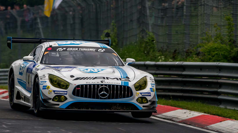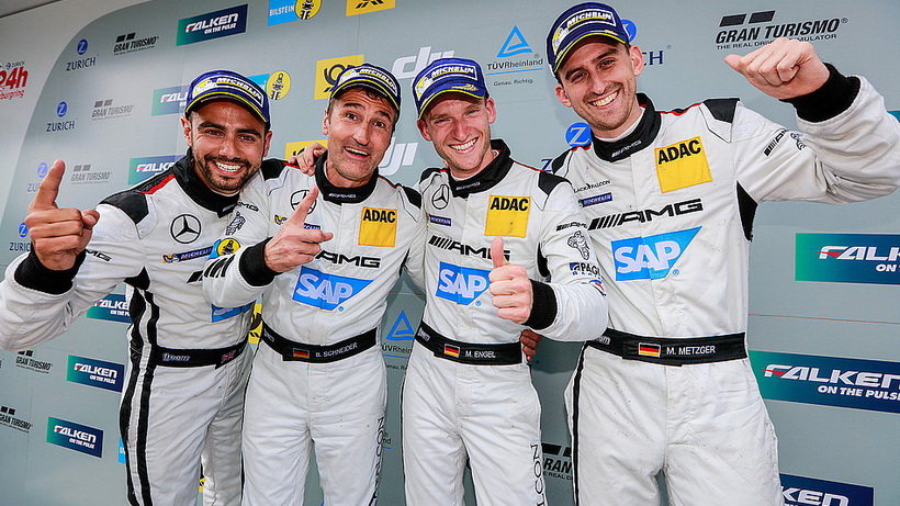 Οι νικητές του φετινού 24ωρου αγώνα του Nurburgring με την #4 Mercedes AMG GT3 της Black Falcon. Μεταξύ αυτών ο πολυπρωταθλητής DTM και θρύλος των αγώνων Τουρισμού, Bernd Schneider.