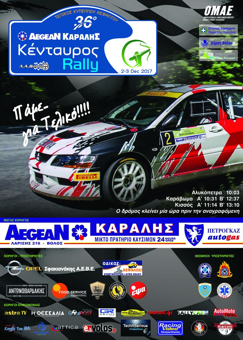Όλα είναι έτοιμα για το 36ο Ράλλυ Κένταυρος 2017, που διοργανώνεται από το Αθλητικό Σωματείο «Λέσχη Αυτοκινήτου Βόλου» (Λ.Α.ΒΟΛΟΥ) και αποτελεί τον Τελικό του φετινού Κυπέλλου Ασφάλτινων Ράλλυ, μέσω του οποίου θα κριθεί ο Κυπελλούχος σε Γενική και F2. Αυτό έχει ως αποτέλεσμα ο αγώνας να έχει ιδιαίτερη βαρύτητα και υψηλό επίπεδο συμμετεχόντων. Από τη στιγμή μάλιστα, που στον αγώνα θα συμμετάσχουν και πληρώματα που δεν προσμετρούνται στην Τελική βαθμολογία του θεσμού, το ενδιαφέρον θα είναι διπλό, καθώς κάποιοι θα ριχτούν στη μάχη του Πανελλήνιου Κυπέλλου Ασφάλτου και από την άλλη, κάποιοι άλλοι στη μάχη για τη νίκη. Το Ράλλυ Κένταυρος προσμετρά στο Πανελλήνιο Κύπελλο Ασφάλτου με συντελεστή 2, το οποίο πρακτικά σημαίνει πως τα πληρώματα που θα βαθμολογηθούν, θα λάβουν τους διπλάσιους βαθμούς.