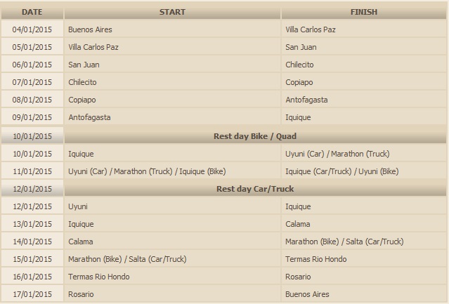 Τέλος, να σημειωθεί ότι η πρώτη ειδική διαδρομή διεξάγεται Κυριακή (4/1), ενώ η συνολική απόσταση του αγώνα ξεπερνά τα 9.000 χιλιόμετρα. Στη φετινή διοργάνωση θα λάβουν μέρος 144 αυτοκίνητα, 167 μοτοσικλέτες, 68 φορτηγά και 50 quads.