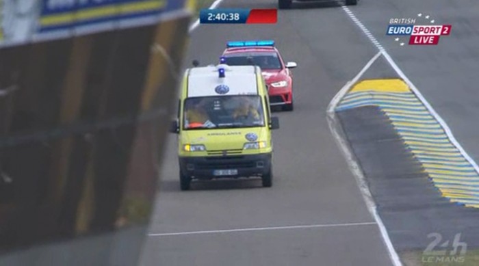 Ο Γάλλος Loic Duval, ένας από τους οδηγούς του Audi R18 με τον αριθμό 1, έχασε τον έλεγχο του πρωτοτύπου στις στροφές που φέρουν το όνομα της «Porsche» και προσέκρουσε με πολύ δύναμη στις προστατευτικές μπαριέρες.