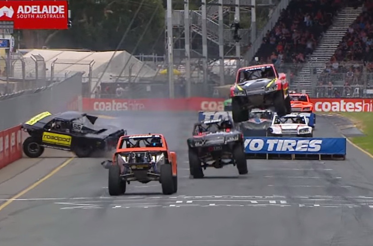 Ξεχάστε το “Stadium”. Στο video θα δείτε τα Super Τrucks στη γνωστή παλιά πίστα F1 της Adelaide στην Αυστραλία. Πίστα αγώνων ταχύτητας με τα kerbs και τα όλα της. Συν ράμπες για να απογειώνονται τα φορτηγά, όπως κάνουν συνήθως.