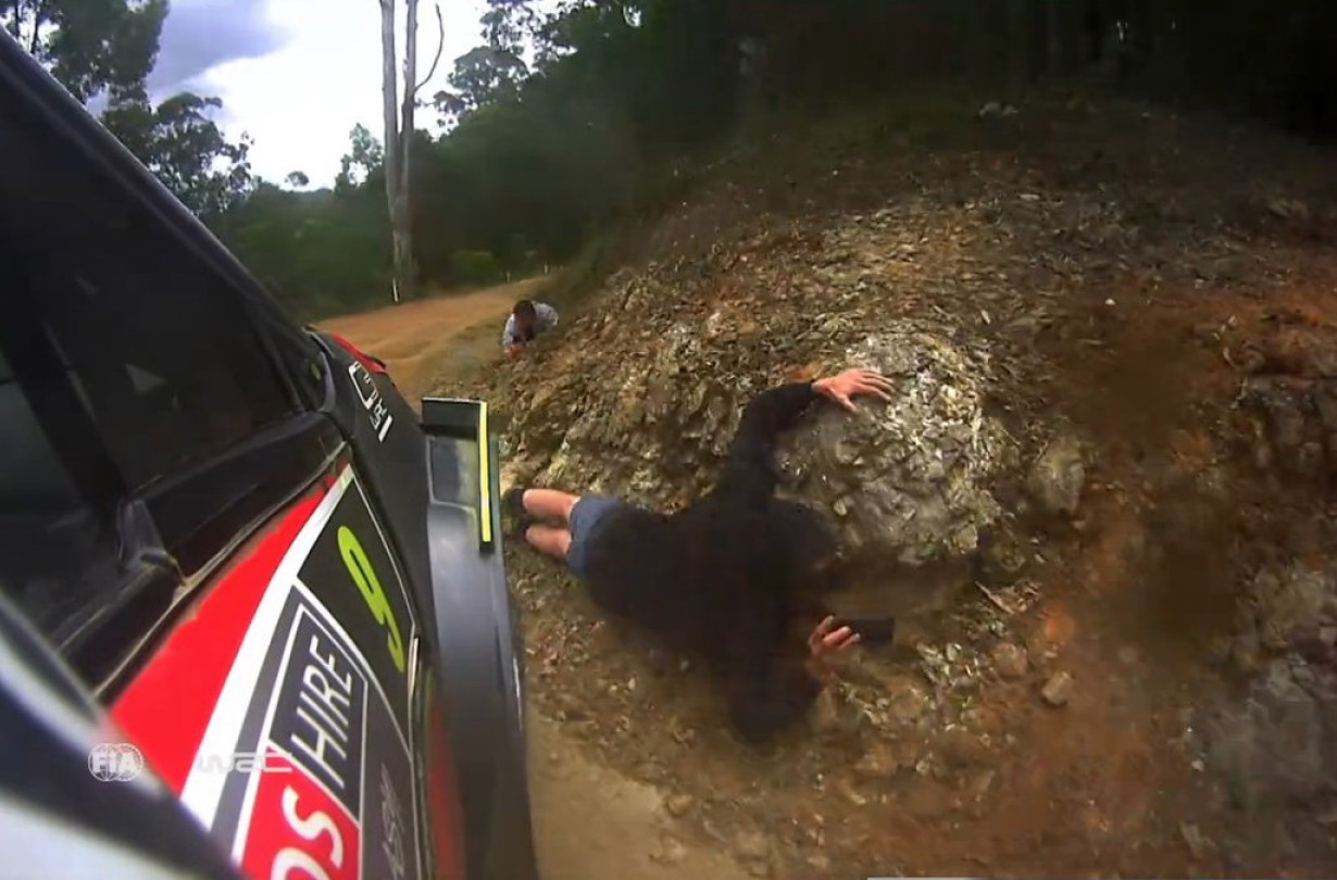 Οι (πραγματικοί) φαν του WRC, που έβλεπαν το Ράλι Αυστραλίας στο WRC+, είδαν αυτούς τους τύπους στη 12η ειδική διαδρομή, Welshs Creek, να κάθονται και να φωτογραφίζουν από αυτές τις ασύλληπτα επικίνδυνες θέσεις. Και τους είδαν από τα in-car videos πολλών οδηγών, γύρω στο 3’ 15” από την εκκίνηση της ειδικής.