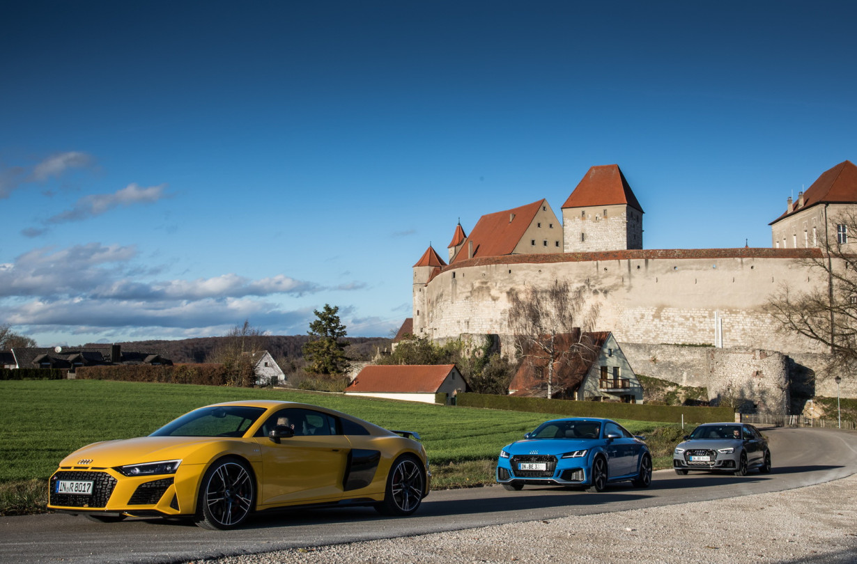 Τρεις σύντοµες «µιζιές» έκαναν το πάρκινγκ του αεροδροµίου στο Μόναχο να σειστεί εκ θεµελίων. Τα καυσαέρια του 5.2 V10 του R8 Performance και του 5κύλινδρου 2.5 των TT RS και RS 3 Sportback, άρχισαν να εκτονώνονται µε ένα βροντερό γουργουρητό από έξι παχιές οβάλ εξατµίσεις. Εµπρός µας περίµεναν σχεδόν 300 km έως το Neckarsulm, τη βάση της Audi Sport. Περνώντας από ένα µέρος του Romantic Road της Γερµανίας, η διαδροµή µοιάζει ιδανική για να αναδείξει όλες τις αρετές των RS.