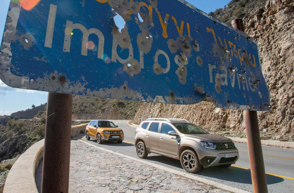 Υπάρχει μια σημαντική διαφορά φιλοσοφίας μεταξύ του σημερινού Duster και του σημερινού Vitara. Την καταλαβαίνεις ήδη από τη στιγμή που κατεβαίνεις τον καταπέλτη του πλοίου: Το Dacia αντιμετωπίζει τις χαρακτηριστικές πτυχώσεις της λαμαρίνας με πιο απαλό τράνταγμα από το Vitara που είναι αισθητά πιο σφιχτό. Πιο ασφάλτινο θα το χαρακτήριζες σε πρώτη ανάγνωση.