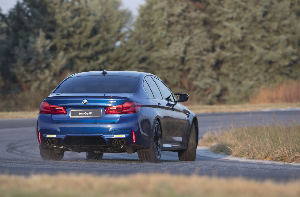 Στον επαρχιακό ξεχνάς τη 2η. Μεταξύ 3ης και 5ης, στο μισό γκάζι, είσαι άπιαστος. Με την κίνηση να μεταδίδεται σε όλους τους τροχούς και MDM Sport, απολαμβάνεις το πλαίσιο χωρίς το άγχος της υπερβολής. Τα φρένα έχουν γραμμική αίσθηση, ενώ αργότερα στην πίστα θα αποδειχθεί ότι έχουν και αγωνιστική απόδοση και αντοχή. Η ηλεκτρονικά ελεγχόμενη ανάρτηση με διπλά αλουμινένια ψαλίδια εμπρός, πολλαπλούς (αλουμινένιους, επίσης) συνδέσμους πίσω και ενεργά αμορτισέρ, δεν επιτρέπει τη μεταφορά βάρους. Ούτε κατά τον διαμήκη, ούτε κατά τον εγκάρσιο άξονα. Σε συνδυασμό με το μεταβαλλόμενο λόγο της κρεμαγέρας, αρκούν μικρές κινήσεις των χεριών για να την τοποθετείς. Το εμπρός μέρος εκτελεί πιστά, το σύνολο είναι εντυπωσιακά ανάλαφρο, πρόθυμο και ακριβές στο πρώτο μισό της στροφής, από την είσοδο ως την κορυφή. Όχι μόνο κρίνοντας με βάση τον όγκο και το βάρος, συνήθως μια καλή δικαιολογία. Αλλά και με απόλυτα κριτήρια για σπορ αυτοκίνητα. Στην έξοδο πατάς τόσο νωρίς και τόσο πολύ που δεν θα τολμούσες ποτέ ούτε καν να σκεφτείς με την παλαιότερη πισωκίνητη. Όχι τόσο για τον φόβο του τετακε, όσο γιατί η ουρά θα έσπρωχνε τη μούρη. Εδώ το M xDrive και το Cornering Brake Control, στην ουσία ένα σύστημα torque vectoring, κάνουν ό,τι πρέπει για να βιδώσει ο εμπρός εσωτερικός τροχός και να βγεις στην έξοδο με μια μετρημένη πάντα σε γρήγορο ρυθμό. Όπως ακριβώς αρμόζει σε μια M5. Αντιλαμβάνεσαι στην πράξη και με τον πλέον πειστικό τρόπο ότι είναι ένα κατά βάση πισωκίνητο αυτοκίνητο που στέλνει ροπή εμπρός μόνο αφού έχει δημιουργηθεί μια υπερστροφική τάση.