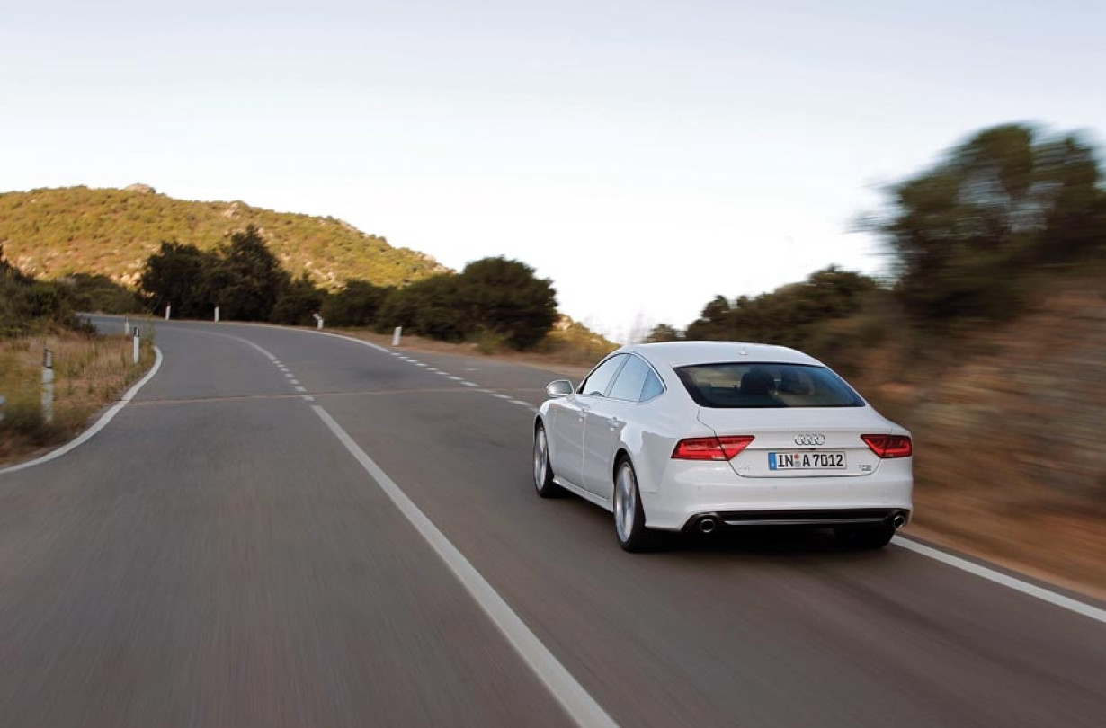 Το Α7 είναι απρόσμενα ευχάριστο στην οδήγηση, για την κατηγορία και τις διαστάσεις του. Το βάρος μιας καλά εξοπλισμένης έκδοσης φλερτάρει πιεστικά με τους δύο τόνους, όμως με στριμμένους τροχούς φαίνεται σημαντικά ελαφρύτερο. Η καινούργια, ηλεκτρονικά ελεγχόμενη αερανάρτηση της έκδοσης 3.0 V6 TFSI σιδερώνει τις ανωμαλίες του οδοστρώματος χωρίς να επιτρέπει κλίση στις στροφές ή βουτιές στα φρένα. Χαμηλώνει μάλιστα ανάλογα με την ταχύτητα μέχρι και 20 mm, φέρνοντας το κέντρο βάρους πιο κοντά στο έδαφος. Το τιμόνι έχει αρκετά καλή αίσθηση. Μόνο μια ανεπαίσθητη ελαστικότητα του μπροστινού συστήματος, τις πρώτες στιγμές της μεταβολής της κινητικής κατάστασης στην είσοδο της στροφής, προδίδει ότι δεν πρόκειται για σπορ κατασκευή αλλά για ένα πολυτελές GT.