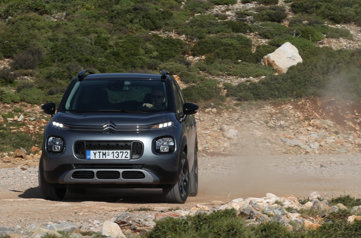 Κατά τα άλλα, η ανάρτηση και αυτού του C3 Aircross πετυχαίνει το γνώριμο, κορυφαίο επίπεδο άνεσης στην πόλη. Το πολύ ελαφρύ τιμόνι και ο χαλαρός λεβιές ταχυτήτων δημιουργούν ένα ξεκούραστο σύνολο. Κάθε απότομη κίνηση όμως στο τιμόνι ή το φρένο/γκάζι έχει αισθητή επίδραση στο πλαίσιο, το οποίο γέρνει ή βουτάει, αντίστοιχα. Δεν θα σε ενοχλήσει ούτε στον αυτοκινητόδρομο, αν οδηγείς ομαλά, παρά μόνο υπό πίεση. Το μεσαίο πεντάλ εμπνέει εμπιστοσύνη, τα λάστιχα M+S όμως γλιστράνε νωρίς, οπότε δεν πετυχαίνει κάτι καλύτερο από 41,2 m για το 100-0 km/h. Από την άλλη, έχει ένα ισχυρό ατού εκτός ασφάλτου, σε συνδυασμό με τα προγράμματα του Grip Control και την απόσταση των 17,8 cm από το έδαφος.