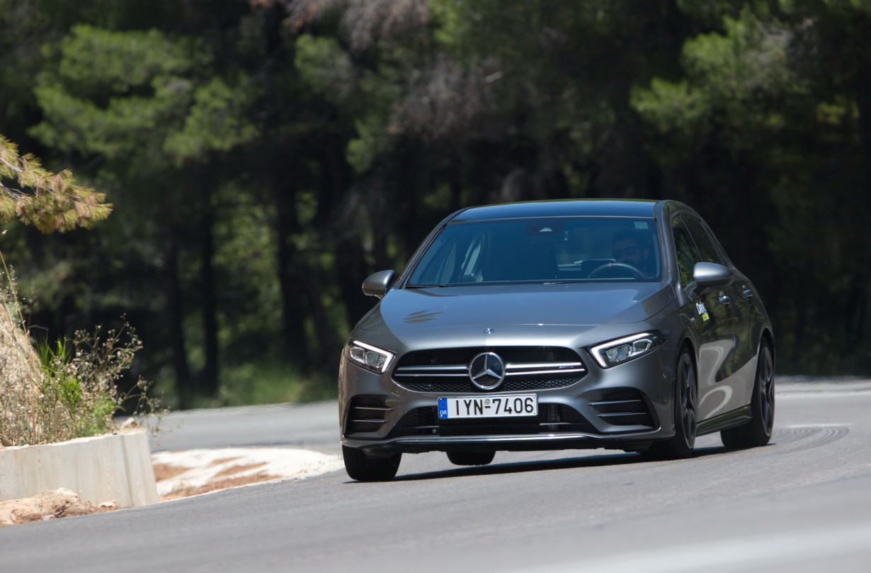 Με όλα αυτά βέβαια µπορείς να ασχολείσαι µόνο όσο σου το επιτρέπει ο δρόµος και ο ρυθµός που ακολουθείς. Από εκεί και πέρα, αναδεικνύεται το AMG πρόσωπο της A 35. Οι ανοιχτές στροφές χωρίς να συνοδεύονται απαραίτητα από εξαιρετική άσφαλτο αναδεικνύουν τη φοβερή πρόσφυση που προκύπτει από το συνδυασµό της τετρακίνησης µε τα Continental Sport Contact 6, διάστασης 235/40 R18.