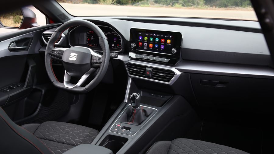 Στο εσωτερικό, η αλλαγή είναι ολοκληρωτική. Το ταμπλό είναι λιγότερο ογκώδες αλλά παραμένει οδηγοκεντρικό, παραπέμποντας σε αγωνιστικό κόκπιτ. Υπάρχουν στοιχεία δανεισμένα από το Golf, όπως το πάνελ αφής για τα φώτα, όμως η συνολική εικόνα είναι αρκετά διαφορετική. Στο επίκεντρο του ενδιαφέροντος βρίσκεται μια οθόνη αφής 8,25" (στάνταρ σε κάθε Leon), με φυσικά πλήκτρα συντομεύσεων και περιστροφικούς διακόπτες που διευκολύνουν τη χρήση της –όμως το a/c ελέγχεται μόνο μέσα από την οθόνη. Στην έκδοση FR, ο αναλογικός πίνακας οργάνων δίνει τη θέση του στο SEAT Digital Cockpit 10,25", που προσφέρει τεράστια ποικιλία διαμόρφωσης της εμφάνισής του και των πληροφοριών που απεικονίζει.